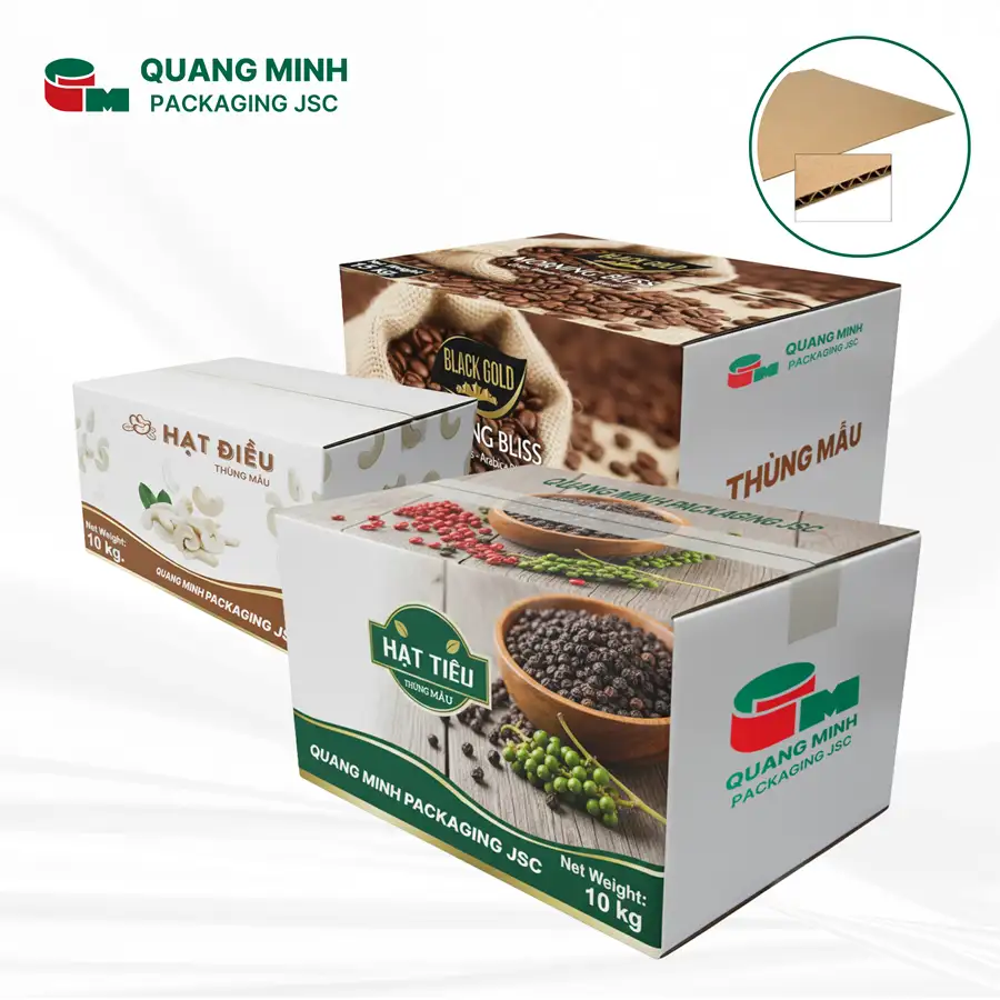 Quang Minh Packaging JSC supplies specialized carton boxes for dry agricultural products, simultaneously meeting requirements for protection, durability, and stacking stability in warehouses and shipping containers.